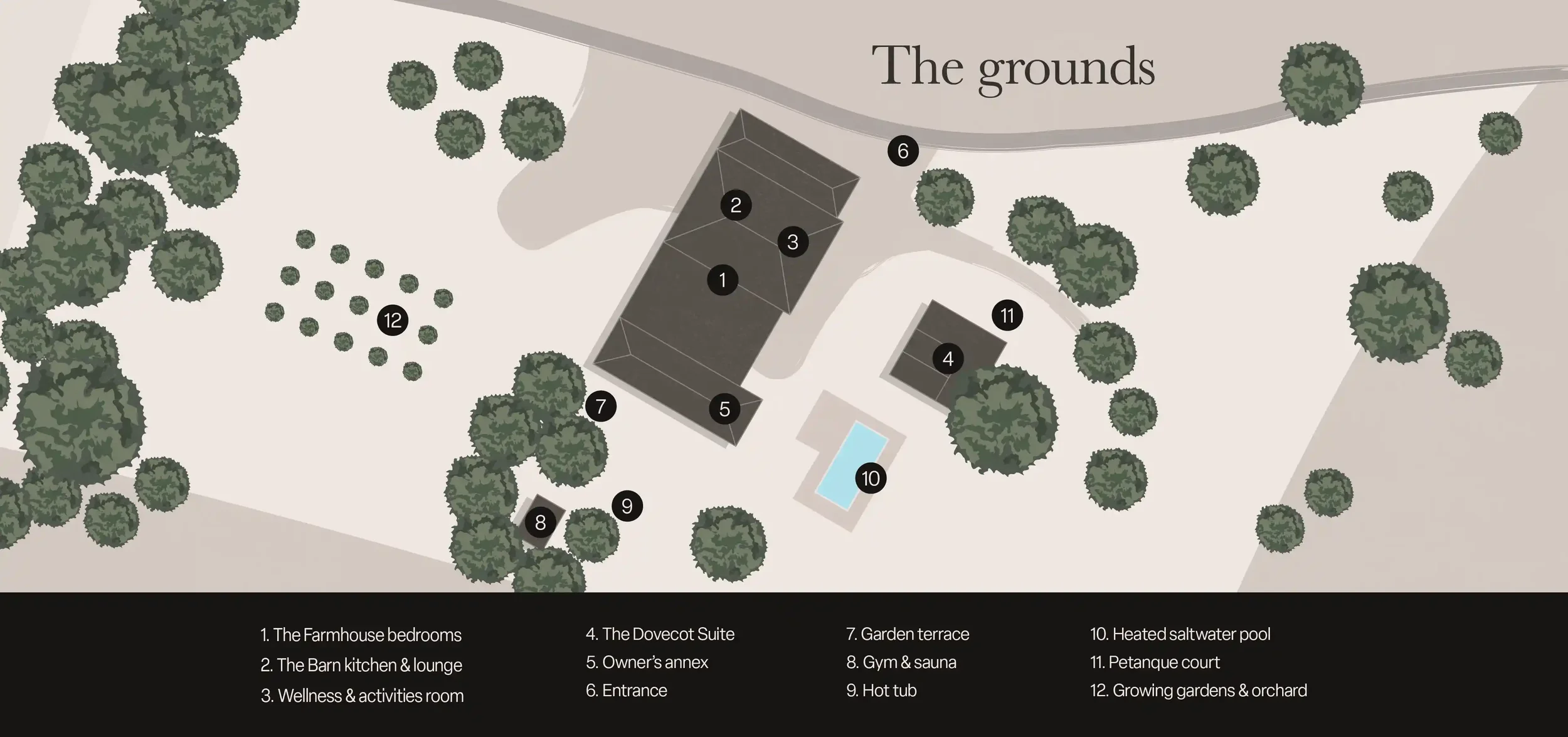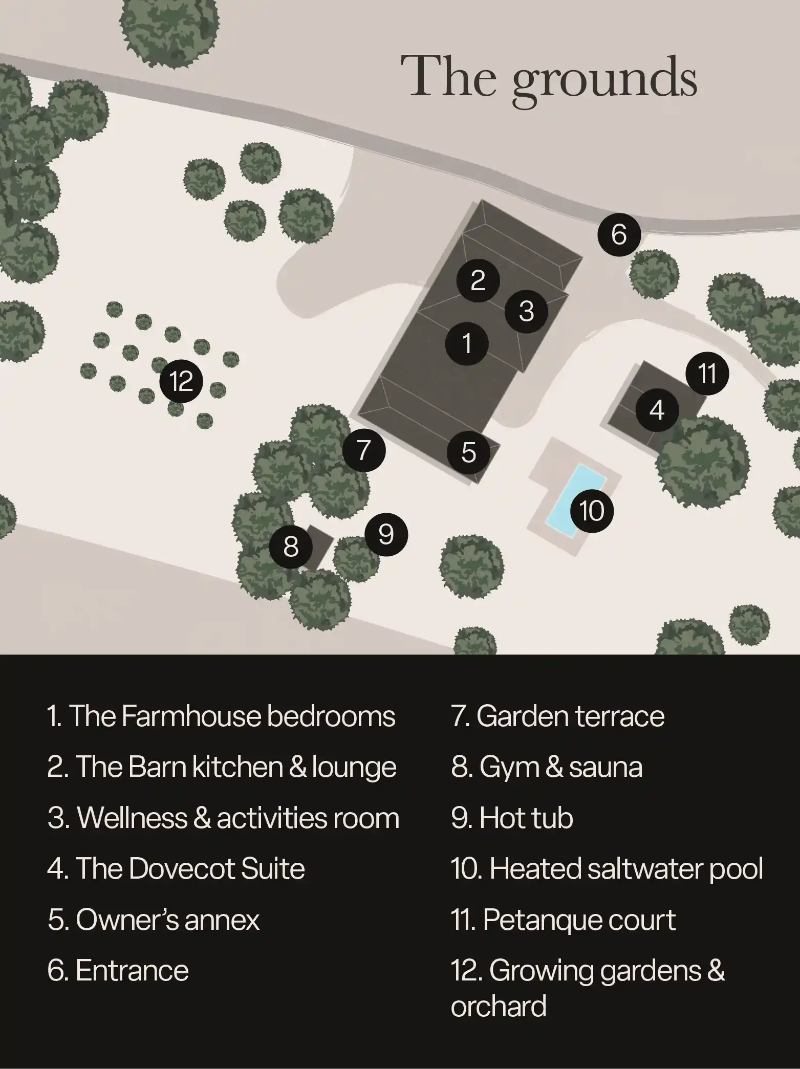 The heart of Plates Farm. Its five deluxe en-suite bedrooms, salon and games room flow seamlessly on the terraces, lawns and down to the heated saltwater pool below.